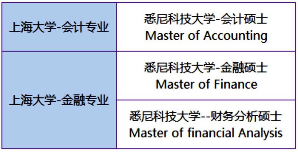 2138cc太阳集团—悉尼科技大学“1+1”硕士双学位项目由2138CC太阳集团与澳大利亚悉尼科技大学合作开办。两所院校均为国内领先,具有卓越国际影响力的知名院校。就读本项目的学生将系统地参加两所高校联合提供的课程,在国内完成第一学年的课程以后,前赴澳大利亚悉尼科技大学进行海外学习。以国际化资源为依托,在多元文化背景下,学习和研究实用和综合的前沿商业教育方法,为进入一个需要更多特定学科专业知识的世界做好准备,成为综合性的学习者,以应对全球化世界中面临的各种挑战。申请专业对应信息如下: