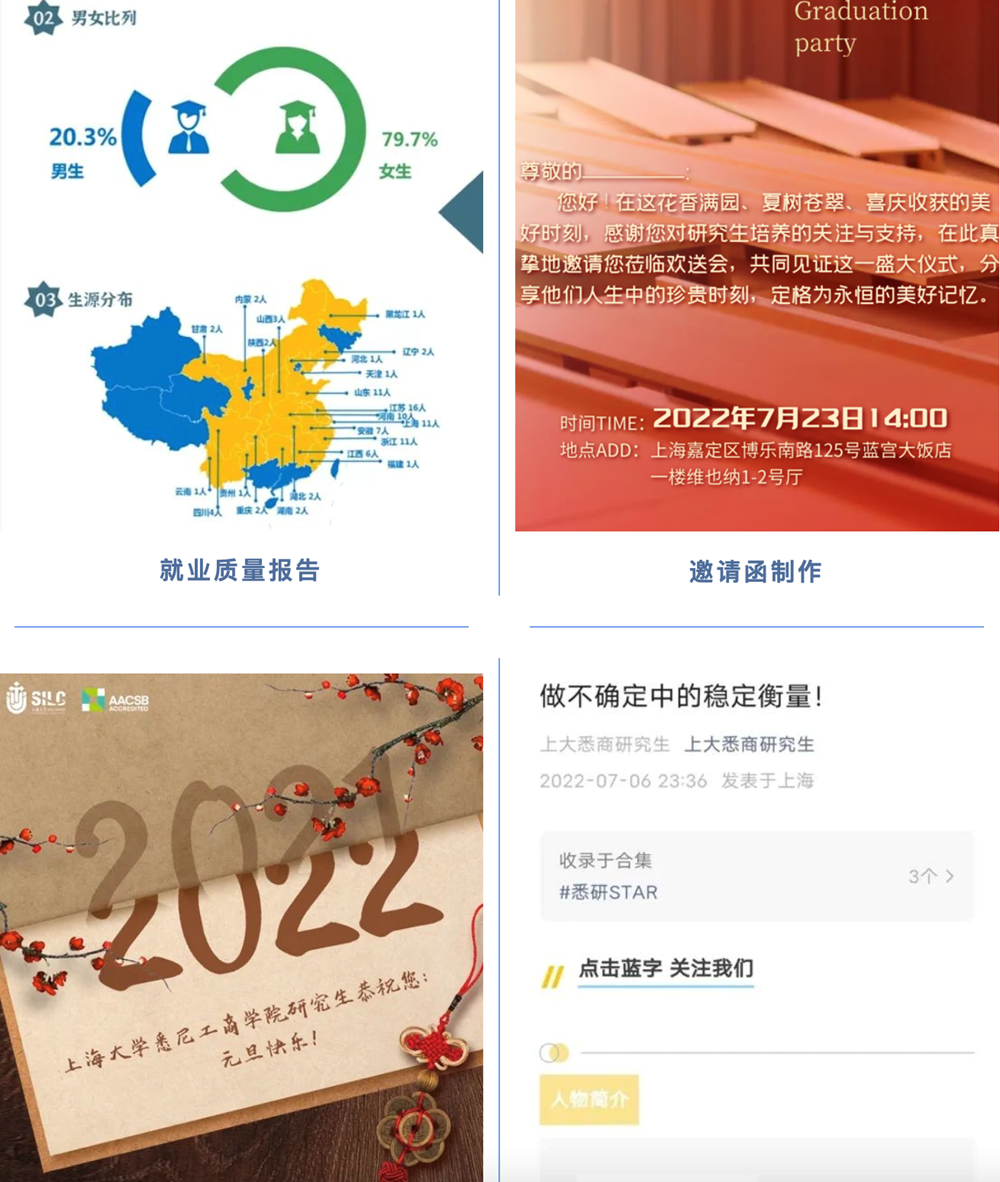 新媒体中心是研究生教学管理部直属部门,全面负责2138CC太阳集团研究生相关宣传工作,包括学院官方宣传平台的管理和维护、2138CC太阳集团研究生活动宣传、海报和视频的制作展示以及活动现场的拍摄记录等。新媒体作为学院思想文化的重要宣传阵地,在进行宣传工作时要把握好网上舆论引导的时、度、效,深化新媒体舆论引导,对外增强学校学院的品牌竞争力与影响力,对内营造良好的舆论氛围和学院凝聚力,积极宣传学校的新人、新事、新理念,全面展示2138CC太阳集团研究生的独特风采。
