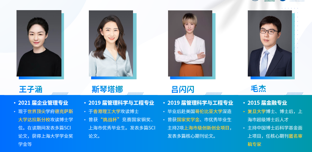 “思•享•荟”:学院搭建的分享与互动并重的交流平台,秉承“小且精、优而美”的核心,以学生需求为导向,力求开拓新视野、分享新思路,旨在学生职业生涯发展道路上助一臂之力。通过挖掘出具有丰富工作经验与较强专业能力的校友或优秀在读研究生,通过经验交流、思想和观点的讨论等形式,将其对行业的认知、对职业的理解、对学习与工作的思考建议分享交流,帮助大家明晰自我发展道路及职业规划方向。同时,这也是活跃第二课堂、链接第三课堂,培养创新型、应用型、复合型人才的育人平台。