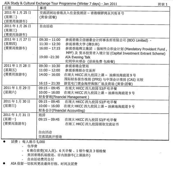 AIA(Association of International Accountants 国际会计师公会)香港分会为促进中港两地高等院校学生在国际会计、财务、管理方向的学习及文化交流,自2006年起开始主办《学术及文化交流项目》。具体信息可查询www.aiaworldwide.com,或到文荟楼底楼前台领取相关资料。 2011年1月该项的招募工作现已开始,具体行程安排请见Arrangement_201101。有兴趣的同学可在11月12日前填写Application Form,并将此表交到文荟楼402室张老师处。 活动组织方会根据报名人数进行筛选,最终名单在12月6日前公布。