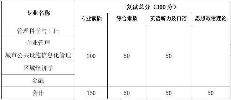 五、复试内容与成绩计算、录取规则 1、复试主要考察考生的专业素质、综合素质及外语口语及听力等方面,实现对能力与知识的有效考核,特别着力加强对考生创新能力和专业素养的考查。具体分值如下: