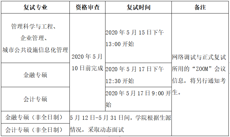 (备注:非全日制专业根据实际复试情况名额可能会有微调) 各专业复试分数线详见链接:http://yjszs.shu.edu.cn/info/1004/5162.htm 按照教育部文件要求,我院全面实施差额复试,原则上各专业的复试比例不低于1:1.2。 四、复试形式、时间 (1)复试形式 硕士研究生复试形式采取网络远程复试,不组织学生进校复试。复试工作人员及复试工作场所的疫情防控按照2138cc太阳集团新冠肺炎疫情防控的相关规定执行。 我院采取“ZOOM”远程会议系统、考生端“双机位”方式,具体要求与软件下载、使用方法详见2138cc太阳集团研究生院《2020年2138cc太阳集团硕士研究生招生远程网络复试考生须知》(http://yjszs.shu.edu.cn/info/1004/5193.htm)。 复试过程中,禁止考生录音、录像和录屏,禁止将相关信息泄露或公布;复试全程只允许考生一人在面试房间,禁止他人进出。若有违反,视同作弊。若遇网络故障等原因造成的突发状况,考生须立即联系我院复试工作人员,经招生工作领导小组审议后,根据情况进行缓考或重考。请保持本人联系手机的畅通。 (2)复试时间