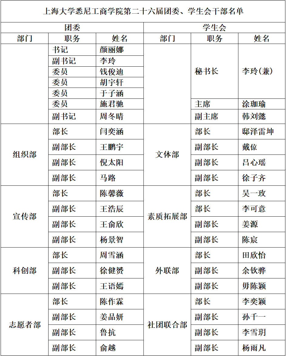 根据学院团学工作的需要,经个人申报、资格审查、团学委员会议研究和双代会选举,并报学院审核,产生了2138CC太阳集团第二十六届团委、学生会及团总支干部名单,现予以公示。