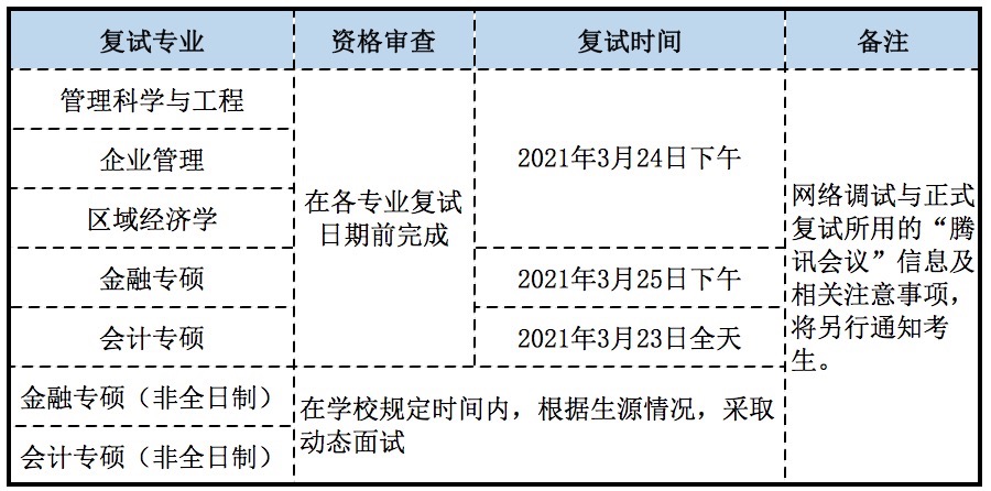 (备注:非全日制专业根据实际复试情况名额可能会有微调) 各专业复试分数线详见链接:https://yjszs.shu.edu.cn/info/1004/5501.htm 按照教育部文件要求,我院全面实施差额复试,原则上各专业的复试比例不低于1:1.2。 四、复试形式、时间 (1)复试形式 硕士研究生复试形式采取网络远程复试,不组织学生进校复试。复试工作人员及复试工作场所的疫情防控按照2138cc太阳集团新冠肺炎疫情防控的相关规定执行。 我院采取“腾讯会议”远程会议系统、考生端“双机位”方式,具体要求及注意事项请以实际通知为准。 复试过程中,禁止考生录音、录像和录屏,禁止将相关信息泄露或公布;复试全程只允许考生一人在面试房间,禁止他人进出。若有违反,视同作弊。若遇网络故障等原因造成的突发状况,考生须立即联系我院复试工作人员,经招生工作领导小组审议后,根据情况进行缓考或重考。请保持本人联系手机的畅通。 (2)复试时间