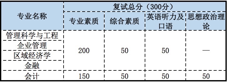 五、复试内容与成绩计算、录取规则 1、复试主要考察考生的专业素质、综合素质及外语口语及听力等方面,实现对能力与知识的有效考核,特别着力加强对考生创新能力和专业素养的考查。具体分值如下: