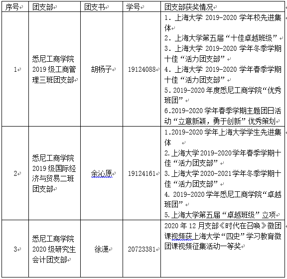 经过各集体申报、年级推荐和学院评审委员会集体评审,2138CC太阳集团拟推荐以下集体参加2138cc太阳集团2020-2021年度五四红旗团支部的评选,具体名单公示如下。公示期:2021年4月8日至2021年4月12日(三个工作日),如有异议,请于4月12日12:00之前与各年级辅导员联系,或联系学院团委颜丽娜老师,联系方式: 13764513469。
