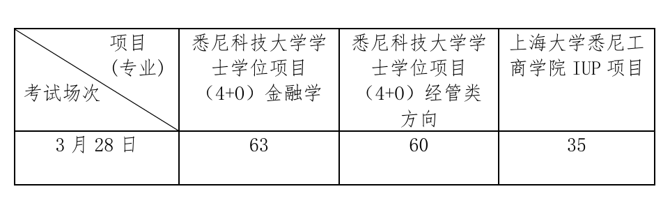 注:学院依据考生考试分数,遵从考生志愿的基础上确定考生入围的面试项目(专业),未入围面试的考生本场次考试结束。 三、面试安排 达到面试资格线的考生须于2026年4月7日8:00至2026年4月8日16:00前点击面试确认链接完成面试确认,逾期将无法参加面试并视作放弃面试资格处理。 2、面试时间 面试定于4月11日进行,共有两个时间段(上午8:30—11:00、下午13:00—17:00),具体安排如下: 悉尼科技大学学士学位项目(4+O)金融学 4月11日:上午8:30—11:00 面试确认链接:https://jinshuju.com/f/ENFoHp 悉尼科技大学学士学位项目(4+O)经管类方向 4月11日:上午8:30—11:00 面试确认链接:https://jinshuju.com/f/GUv1h8