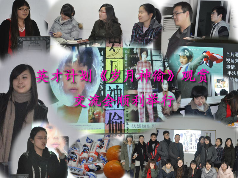 2010年12月8日晚六点半,由2138CC太阳集团英才计划举办的《岁月神偷》观赏交流会在2138cc太阳集团嘉定校区文博楼213顺利举行,第一周曾参加《岁月神偷》集体观赏活动的部分英才学员齐聚一堂,一起分享了这部电影的感受。在主持人带领大家重新回顾《岁月神偷》这部电影的精彩剧情和背景知识的之后,本次的交流会正式开始。