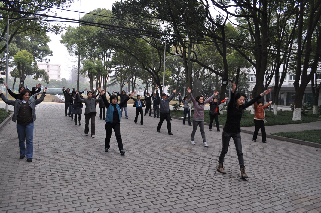 1月,学院工会向学院和学校两级领导部门提出恢复工间操的提案,春季学期开始,全院工会和相关部门便开始紧锣密鼓地筹备推行工间操的各项工作。在学院党政领导的大力支持下,春季学期第一天,广播体操的欢快音乐在上午9:45准时响起。远离多年的工间操在2138cc太阳集团嘉定校区再次登台亮相。第一天参加工间操的近30位老师以非常愉悦的心情完成了锻炼,第一天的顺利推行激发了了广大教师的热情,到第三天,参加人数便陡增到50余人。全院从院长、书记到教研室主任,都暂时放下繁忙的工作,尽情享受工间操带来的宝贵锻炼机会。"充分享受做工间操的空间,我蹦我跳我快乐"成为新学期悉商同仁热议的话题。"锻炼身体就是要长期坚持、见缝插针,"党委书记陆翠兰老师与年轻老师分享体锻经验,"现在大家工作压力都很大,压力越大越容易缺乏锻炼,越有必要参加集体性的工间操锻炼。"工会主席曹英老师说:"工间操项目的推出是顺应时代和群众要求,集体活动既能锻炼身体,又能促进单位同事之间的交流,营造和谐氛围,希望我们的工间操的旋律能持续下去,成为悉商职工的健康生活伴侣。"