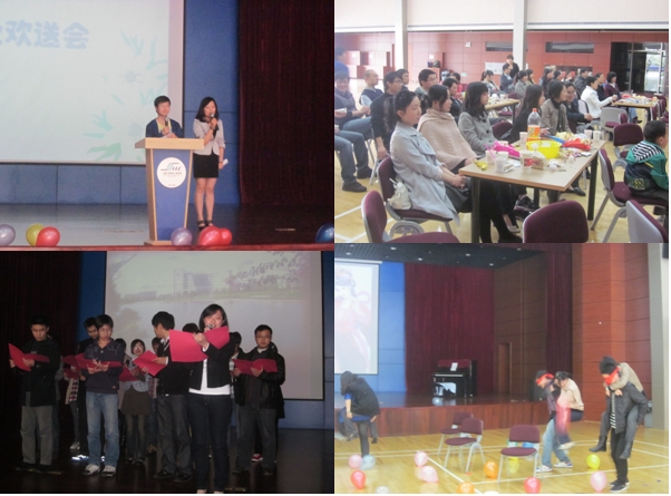 由团支书吴柯佳同学制作播放一段片长约15分钟的视频将欢送会推向了高潮。视频中有领导老师们对这些优秀毕业生们的寄语,有在读研究生送给毕业学长学姐们的祝福之音,还有这些毕业同学们在校期间一幕幕的生活片段。为了制作好这部视频,吴柯佳同学来回穿行于宝山与嘉定校区,花费数天时间,将领导老师以及学弟学妹们的祝福完整拍摄下来,并加以编辑。其他同学也都热情响应这次活动。之后的环节,是毕业生与老师、学弟学妹互动游戏的时间,每个毕业生都格外认真,珍惜自己学生时代的光阴。最后,大家自由交流互道别离,合影留念,大家仿佛有说不完的心里话,一句祝福,一声珍重……毕业生欢送会在声声祝福中临近尾声。