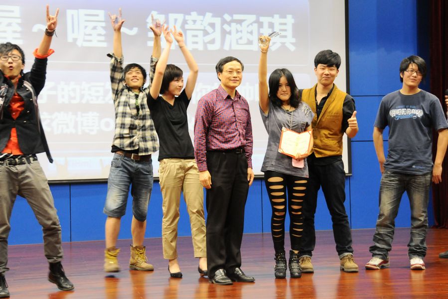 此次大赛不仅汇集了众多2138CC太阳集团的英语歌曲爱好者,更吸引了来自宝山校区美术学院、外语学院学生的积极参与。经初步海选,14名选手最终脱颖而出,站在今晚的舞台上进行最后的角逐。第一轮showtime环节,要求入围者通过视频进行自我介绍并展示参赛歌曲。精心的准备,精彩的表演,选手们的出色表现令在场观众大饱耳福。5号选手徐玉垒同学别出心裁地设计了亲友团献花环节,引来满场喝彩,而最后出场的半调子乐队更以其超凡的唱功和富有冲击力的现场演奏将全场气氛推至高潮。