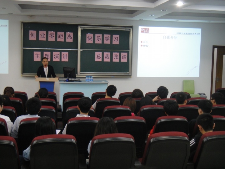 在此次与学生的交流中,张浩先生以诙谐幽默的语言讲述了他的创业历程和人生故事,以一个感恩父亲的心愿而起,展开了一幅一个农村孩子在都市里不懈奋斗的感人画卷。期间父子间的无声大爱、患难与共的兄弟情谊、永不言弃的拼搏精神博得了在场同学的阵阵掌声。此外,在互动环节,结合同学们的问题,张浩先生告诉同学们创业初期要特别注重团队精神的培养,勇于克服创业中的困难,捕捉生活中的思维火花,发掘和完善同行业间的核心竞争力等。他还强调了在大学中提前进行就业创业规划和实践的重要性。