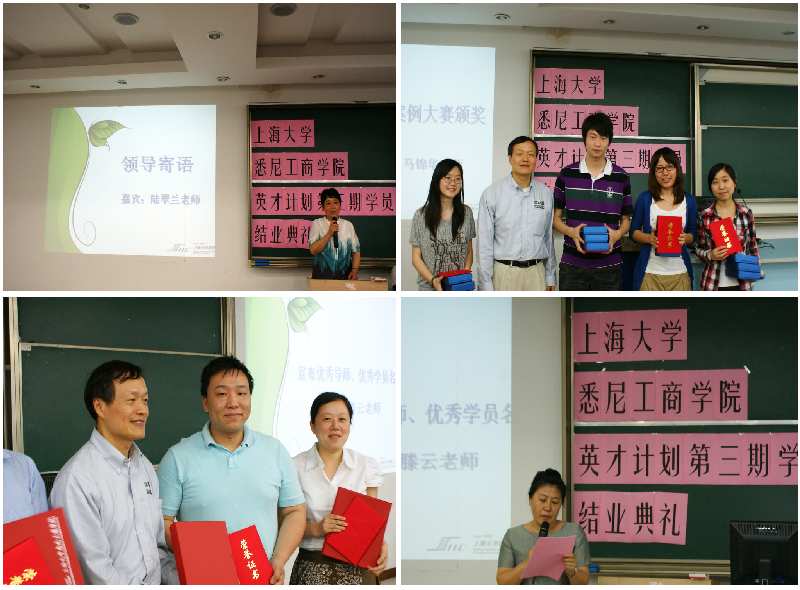 6月2日下午,"英才计划"第三期学员结业典礼暨悉商首届案例大赛颁奖典礼在实验楼报告厅隆重举行。院党委书记陆翠兰、副书记滕云、副院长马锦华、院长助理胡笑寒和部分英才导师应邀出席结业和颁奖典礼,第三期英才学员和首届案例大赛参赛队员参加了此次活动。 负责"英才计划"具体实施的杨炼老师通过真实的数据、简练的语言以及一个精彩的视频回顾了过去一年英才计划的成长和发展,总结了英才指导老师和英才同学提出的一些反馈意见。随后副书记、"英才计划"项目总负责人滕云宣布第三期英才优秀导师和学生名单,副院长马锦华为获奖导师和学员代表颁发了荣誉证书和礼品;他应邀宣布首届悉商案例大赛评奖结果并为获奖参赛队颁奖,并鼓励英才学员继续积极参加各类竞赛活动。优秀导师代表方慧结合自身工作,分享如何借助英才平台促进师生共同进步;优秀学员代表李露滋则以朴实真诚的语言表达了她在"英才"的收获和感受,感谢"英才"的经历让她实现了被英国帝国理工大学录取之梦。