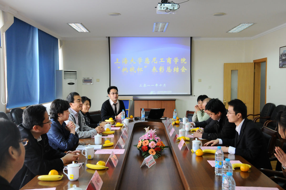 副书记滕云致开场词,向校团委、学院以及各部门的领导老师表示欢迎和感谢,感谢大家对于学院学生培养和科技创新工作的关心与支持。龚思怡院长为指导老师胡珉颁发学院荣誉证书,表彰她此次高水平指导工作。党委书记李双为参赛学生08级包怡龄、林璐璐、赵莉颁奖。学生包怡龄将比赛当天现场情景再现给大家,展示上大学生的优秀风采。指导教师胡珉老师分享了此次比赛后的收获和体会。