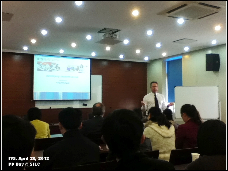 4月20日下午,我院在文德楼三楼学术报告厅举行2012年首次Insearch PD Day讲座和培训活动。 Insearch PD Day培训每年举办两次,时间分别安排在四月和十二月。最近一次讲座在2011年12月举行,主要就"学科审核过程"以及"分级和反馈评估工作"两个课题进行介绍和讨论。在本次讲座中,来自UTS商学院的教育主管Greg Pritchard和项目主管David Wilson分别就"Insearch自我评估和监控项目"、"学生风险管理"以及"评估中的嵌入式课程学习目标体系(PLOs)"等几个主题进行介绍和经验分享。我院教职员工近60人参加了此次培训和交流活动。 本次讲座主要分成两个部分。前半个小时,Greg Pritchard介绍了"Insearch自我评估和监控项目"的问卷和评估方式,并由此引出关于PLOs (Program Learning Objectives)的讨论。David Wilson针对PLOs设立的目标、内容和评估标准对该体系进行深入的介绍,并与我院教师就PLOs引入悉商教学项目的可行性和实施细节等问题进行交流和探讨。吴怡、胡笑寒、吕康娟、吴海宁等多位老师在讨论环节中提问并发表观点。针对诸位老师关于PLOs引入是否会替代现有的教学评估工具的疑虑,Wilson表示PLOs将针对教学过程中的某一个或某几个环节进行评估,但不会影响和替代原有的正常运行的教学评估系统。我院老师表示,学习和了解PLOs是良好的开始,但在具体的实施和实践上还需要进一步的摸索。 在讲座的最后一小时,Greg Pritchard与我院教师和辅导员就"学生风险管理"的话题进行分享和交流,强调教师和辅导员应密切关注学生在校表现,一旦发现异样应及时采取"早期干预"措施,确保学生顺利完成学业和教学项目的质量。(教学管理部) |
