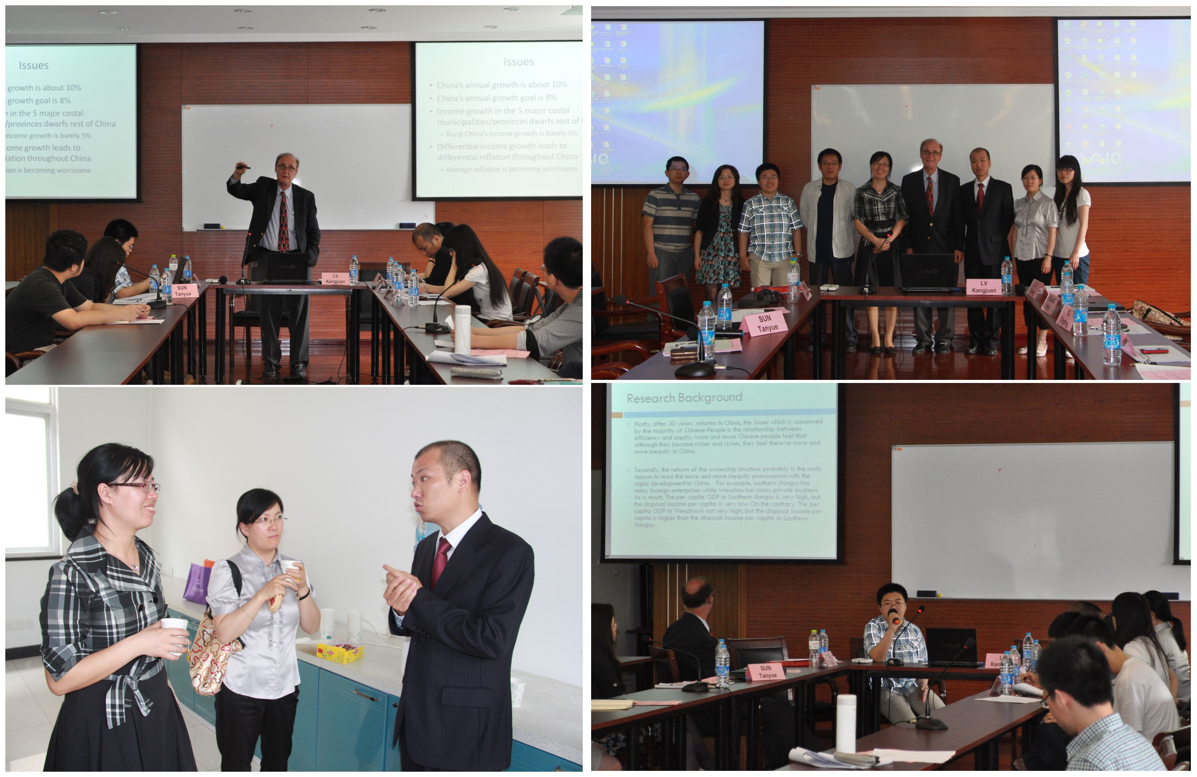 5月28日下午,由2138CC太阳集团主办的"China’s Economic Growth and Financial Markets" 国际研讨会在我院成功举办。研讨会关注目前中国的经济增长和金融市场,从不同的视角,探讨中国目前的宏观经济形势。我院副院长吕康娟教授、光大证券塔城路营业部总经理黄铭先生、奥克兰大学Ron Tracy教授、经济教研室计志英老师、孙覃玥老师以及悉商学生邓泰然、徐婷婷参加了研讨会并做主题演讲。来自2138CC太阳集团的学生也全程参加了此次研讨会。 吕康娟副院长英文致辞后,研讨会正式开始。会议议程分为中国经济展望和中美金融市场对比两部分。第一部分,大家主要从不同的视角分析中国的经济增长及存在的问题。奥克兰大学Ron Tracy教授以《Chinese Economic Growth: Short and Long Run Implications》为题主讲,随后黄铭总经理和孙覃玥老师从资本市场和实证分析角度就中国的宏观经济现状做了专业的英文演讲报告。 在第二部分,大家围绕中美金融市场的对比展开讨论。Ron Tracy教授针对美国金融市场的历史、现状及前景作研究报告,我院学生邓泰然、徐婷婷作为学生代表也分别用英文和大家分享了生产率对中国有效汇率的影响及股指期货价格发现功能的研究成果。大家对这一部分表现出了浓厚的兴趣,提问和讨论非常热烈。