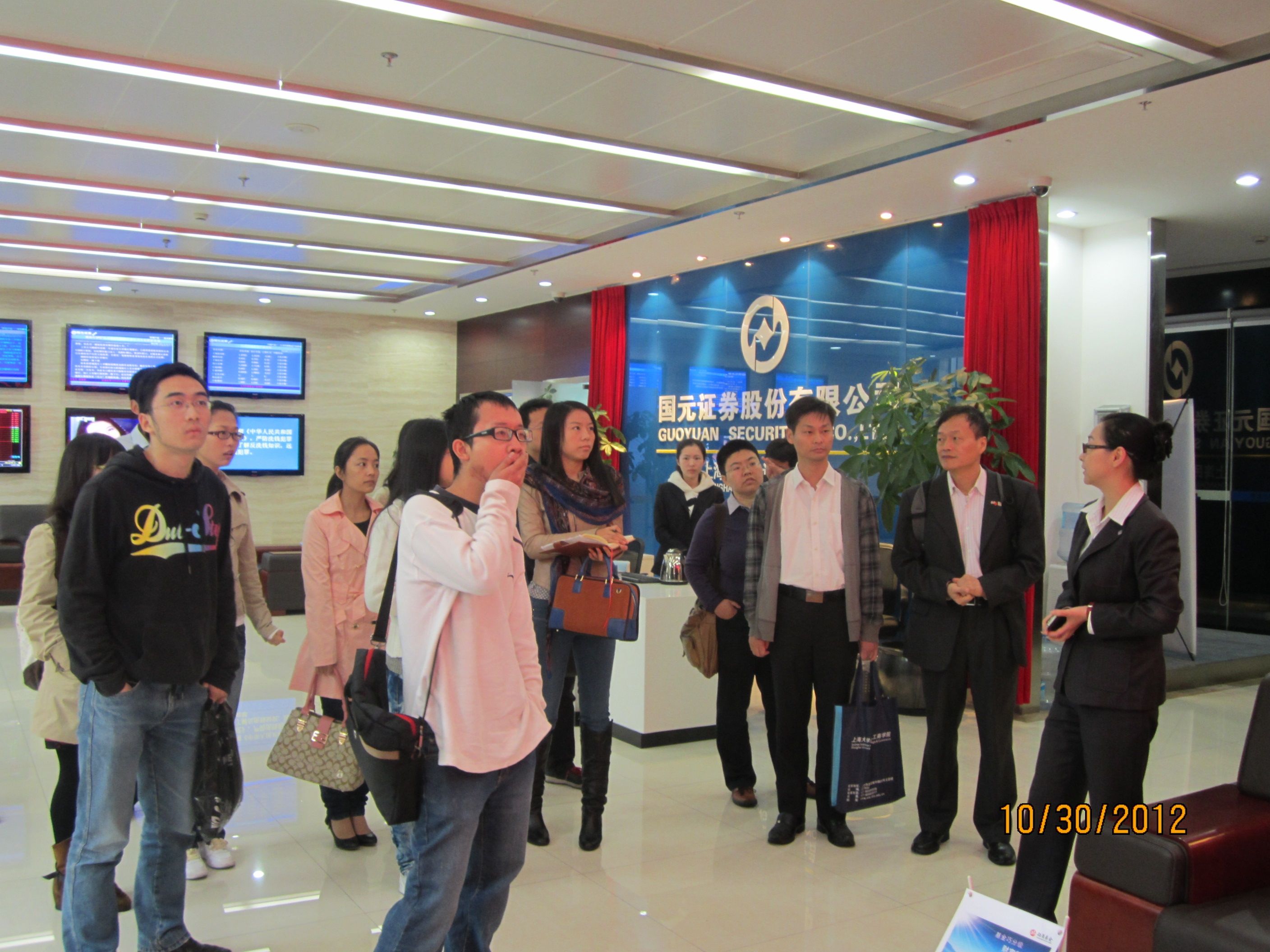 10月30日,2012级金融专硕班在我院马锦华副院长的带领下参观了国元证券和上海证券。 第一站国元证券。国元证券是由原安徽省国际信托投资公司和原安国元证券徽省信托投资公司作为主发起人,于2001年8月设立的。2007年10月30日以股权分置改革为契机,借壳北京化二股份有限公司成功在深圳证券交易所上市。从公司内饰到公司管理,浓郁的徽商文化给国元证券贴上了鲜明的标签。在营业部的会议厅,同学们和国元证券营销部负责人张经理进行了交流,就"财富管理"这一问题开展了激烈的讨论,张经理通过银行和证券财富管理的对比,为同学们做出了详细的解释。随后参观了国元证券的研究所。同学们了解到研究报告生成的一般流程。 下午来到上海证券。上海证券有限责任公司成立于2001年5月,是由原上海财政证券公司和上海国际信托有限公司证券总部新设合并成立的全中国性综合类证券公司。上海证券的张福波总经理为同学们做了一个小型的讲座,他指出证券行业需要的人才要具有一定的数理背景,同时要有良好的自我学习能力,并且要广泛阅读书籍。张经理犀利的言语深入浅出,同学们在欢笑中进一步了解到证券行业鲜为人知的一面。