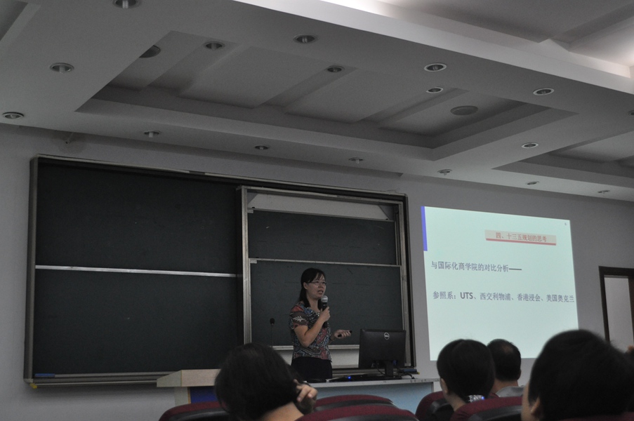 吕康娟首先介绍了教职工学年考核结果、学院人事变动、今年招生情况,并着重针对学院近期正在着力推进的"十三五"规划工作进行了阐释。她把UTS商学院和西交利物浦商学院作为我院的两个参照学院,提出了我院存在的主要不足;她主要就规划中关于学科建设、队伍建设和科研战略的思路进行了详细介绍。