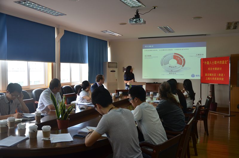 本次研讨会内容主要有两个,首先是对"外籍人士眼中的嘉定"访谈项目第一阶段进行总结,其次是互动讨论,对项目的今后发展进行调整和规划。顾海悦首先对项目进行了概述:"外籍人士眼中的嘉定"访谈项目以语言课程为依托,以主题活动为载体,以服务社会为最终导向,是大学教学改革与服务社会功能有效结合的产物。接着,李佳文、陶醉和张欣怡同学以PPT展示、采访视频和现场采访的方式分享了他们精彩的采访经历和感想。随后,顾海悦老师从调研成果、媒体关注、教师及学生成长等方面总结了项目的阶段性成果。