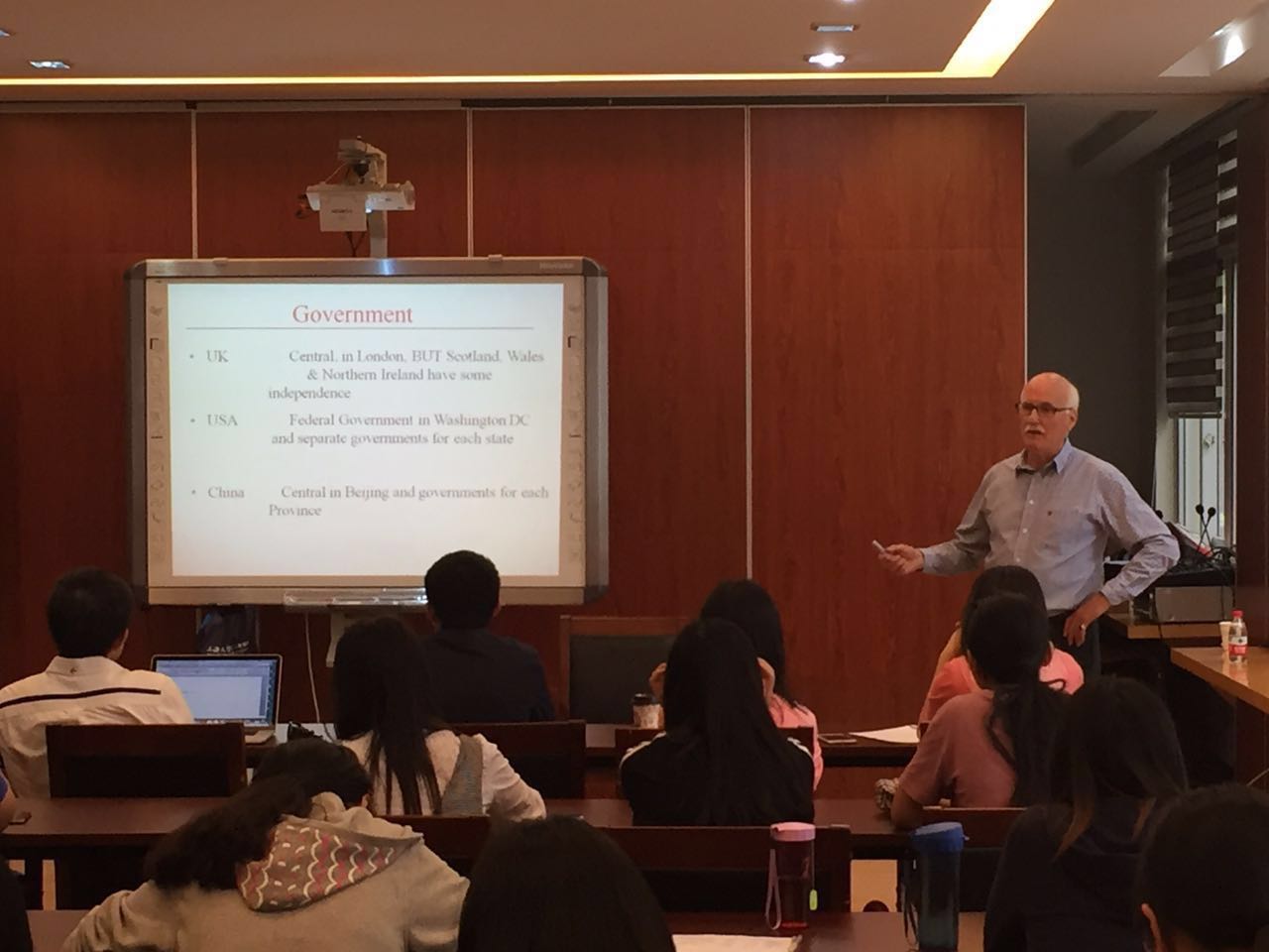 单纯的比较只是认知,Pearson教授随后还举出了很多跨文化交流和融合的实例。譬如在音乐方面,教授讲到了殖民时代英国音乐对美国音乐的影响,并提到了蓝调、摇滚等发源于美国的音乐在英国的落地生根。