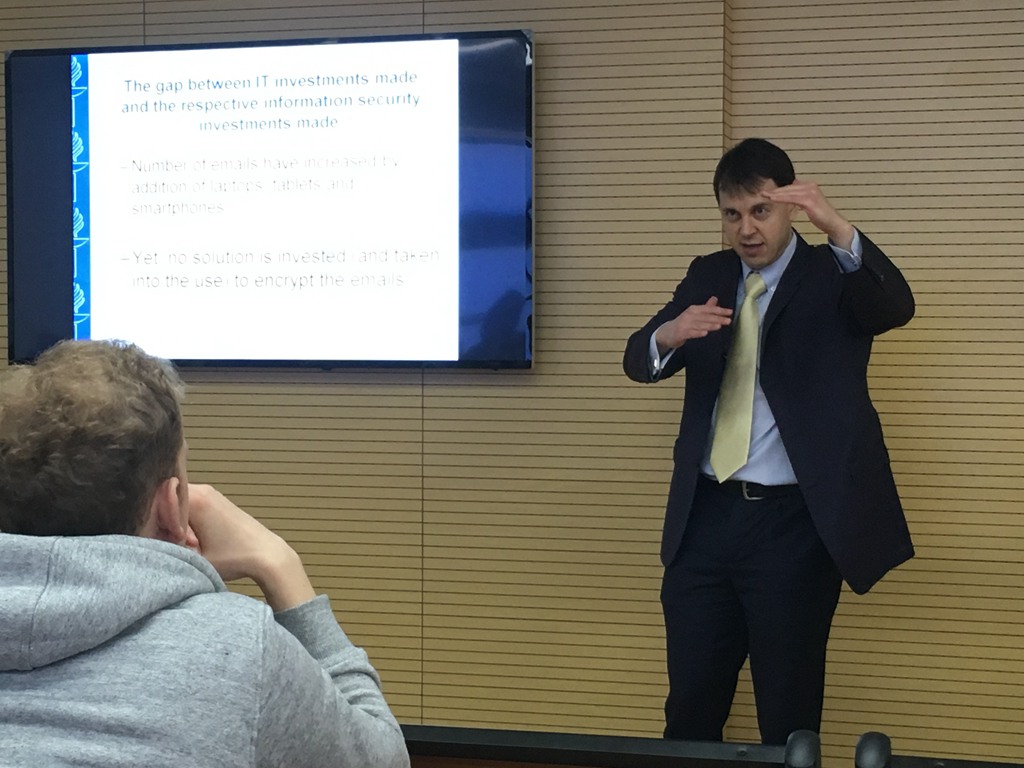 1月15日下午,于韦斯屈莱大学信息技术研究中心主任Siponen教授应邀来我院作题为"Effective Information Security Management in Practice"的讲座。本次讲座由财会系郑小松老师主持,工商管理系陈跃刚老师和各专业本科生、研究生及交流生共同参加。