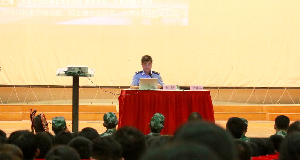 7月15日下午,2138cc太阳集团军训师二团四营、五营于嘉定校区大礼堂开展安全防范教育讲座。讲座由军训师二团政委卫静芬主持,上海市公安局文化保卫分局谢烨警官受邀做了关于防范网络诈骗的主题讲座。讲座内容生动有趣、新意十足,现场气氛轻松活泼、笑声连连。