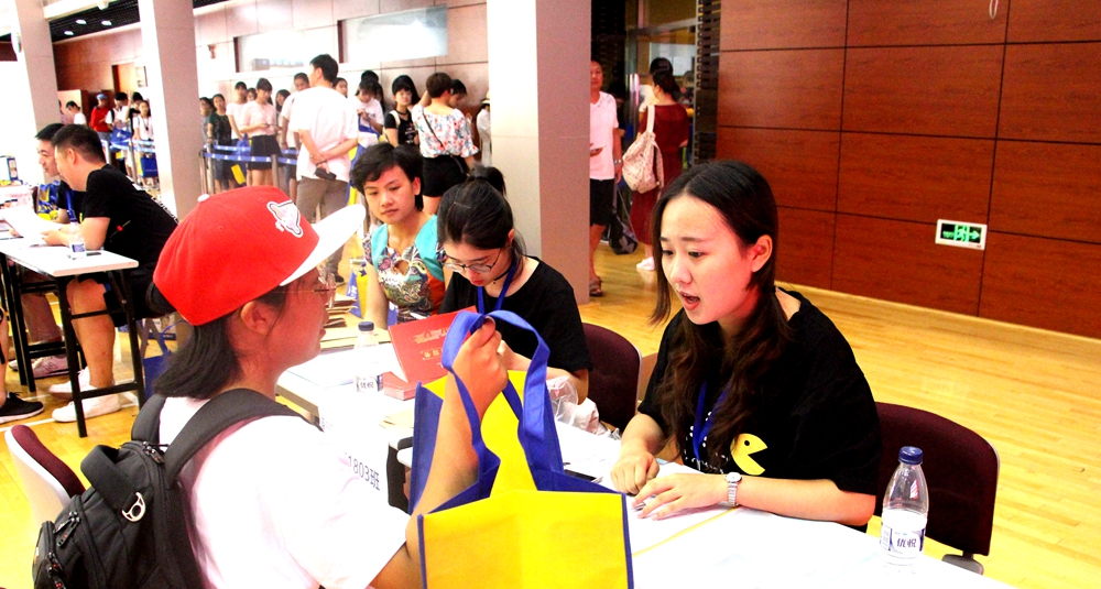早晨七点一过,导生和新生辅导员全体就位,再次确认新生物资、场地布置无误,等待新生的到来。七点二十分,工商管理专业的一位女生成为今年第一位报到的新生,学生家长表示:学生能够考进2138CC太阳集团,全家都很高兴,希望学生能够好好读书,有个更好的未来。报到的新生陆续到来,学院为广大家长设置了休息区,天气虽然炎热,但是行健文体中心内凉意阵阵,家长学生欢声笑语不断。