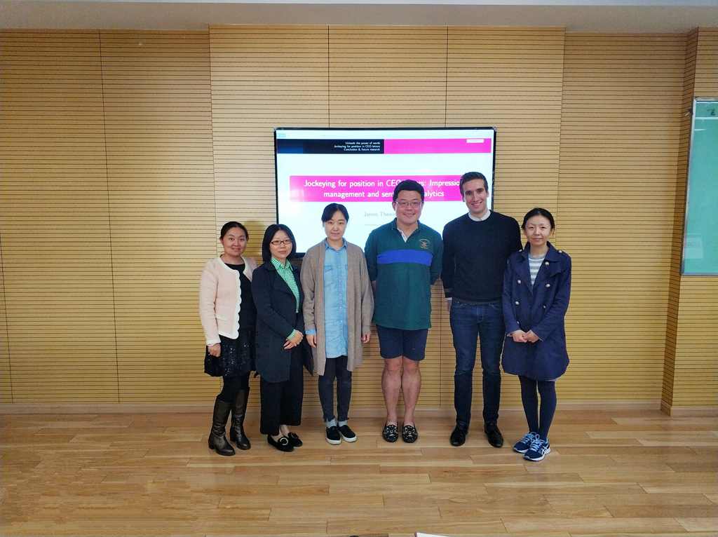 阎蓓蓓老师对Thewissen教授进行简单介绍。Thewissen教授来自比利时鲁汶大学,研究方向包括Financial reporting, textual analysis, impression management and tone management,其优秀研究成果在Journal of Banking & Finance,Financial Management,International Review of Financial Analysis,Accounting & Finance等诸多国际期刊发表。 Thewissen教授通过印象管理和情感分析探讨CEO信函中如何争夺职位。Thewissen教授以财务信息披露中的传统情绪指标为切入点,突出情感的运用对于提高金融市场的效率的重要性,引出之后的三个探讨:财务披露中的情感类用词、利用数据模型科学的计算,总结出情绪对决策的影响以及其决定因素、利用情感词汇来更好地衡量CEO的情绪指标,以便于可以更好的提高对未来业绩的预测精度。最后,Thewissen教授简单介绍了有关正在进行的工作以及修辞风格与分析者的预测行为,引发在座师生的浓厚兴趣,并进行了热烈的提问与探讨。Thewissen教授对我院教师与同学的投入与深入思考表示诚挚的感谢。 此次Thewissen教授用贴近实际的案例和富有感染力的演讲赢得了在座师生们的掌声。之后,师生们与Thewissen教授继续讨论问题、交流观点,Thewissen教授一一给予了认真详细的解答和阐释。(认证办公室) |