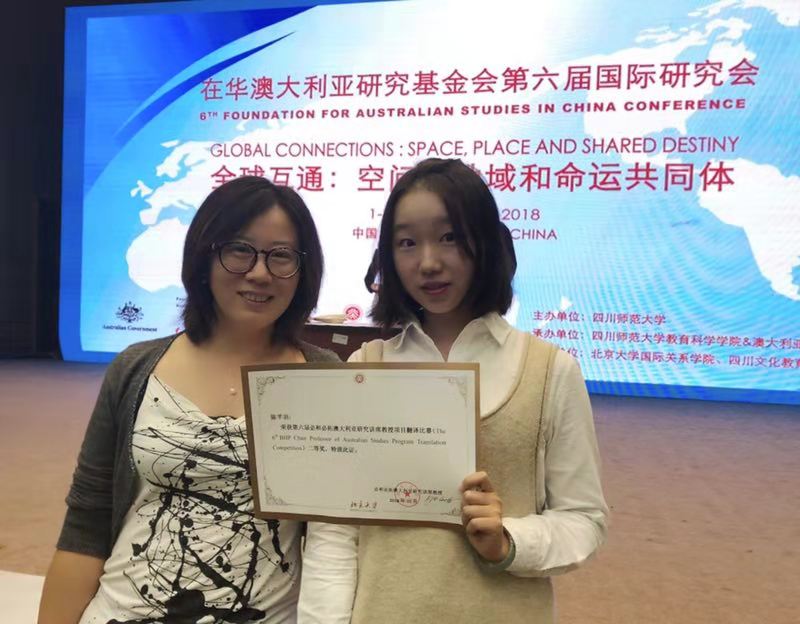 在第六届(2018)必和必拓澳大利亚研究讲席教授项目翻译比赛中,我院学生陈芊羽、肖春连分别获得二等奖和优秀奖,11月4日,出席在华澳大利亚研究基金会(FASIC)学术年会的颁奖典礼。