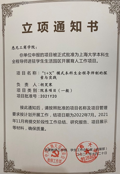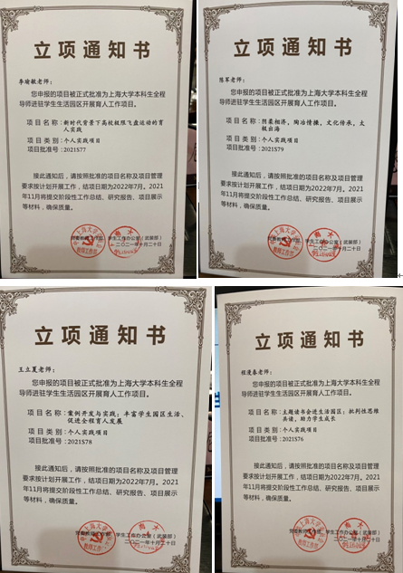 同时,为了更好地推进导师工作与学生生活的相结合,学校在秋季学期伊始发布了关于“全程导师进驻学生生活园区工作项目”的申报通知,学院在全院导师范围内广泛宣传,积极发动教师进行申报。最终,学院申报的院系项目和李瑜敏、程漫春、陈军、王立夏4位老师申报的个人实践项目全部立项。