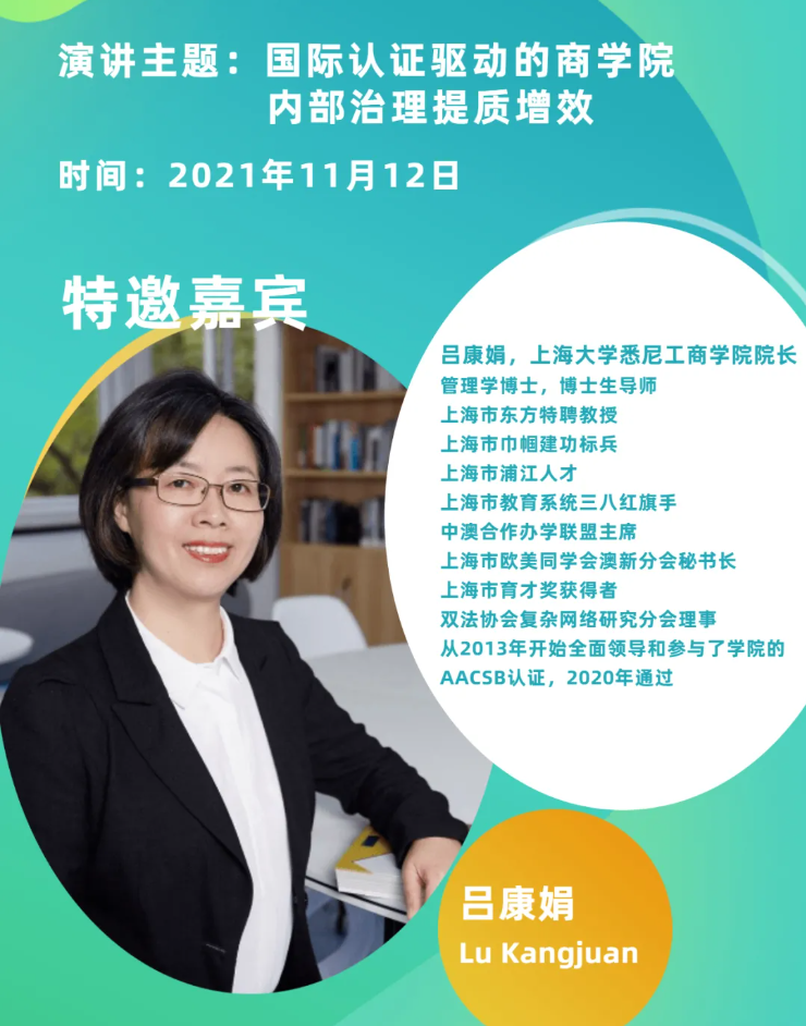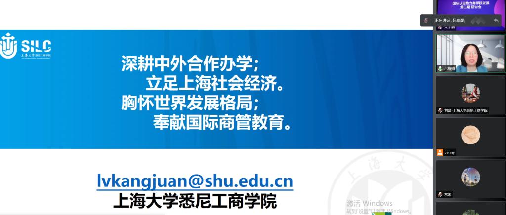 11月12日上午,“国际认证助力商学院发展研讨会”通过腾讯会议方式于线上举行。此次会议由上海毕毕研究院主办,AACSB国际认证东亚区负责人、2138CC太阳集团、上海海事大学以及毕毕研究院分别做了发言。此次研讨会面向AACSB亚太区的会员单位开放,包括西北工业大学、东华大学、北京邮电大学、北京石油大学、上海海洋大学、上海海事大学、宁波大学等院校参加了本次研讨会。我院院长吕康娟教授应邀参会并作主题发言。她介绍了悉商AACSB认证历程和经验总结,并就AACSB认证对学院内部提质增效的带动作用做了重点剖析和经验分享。