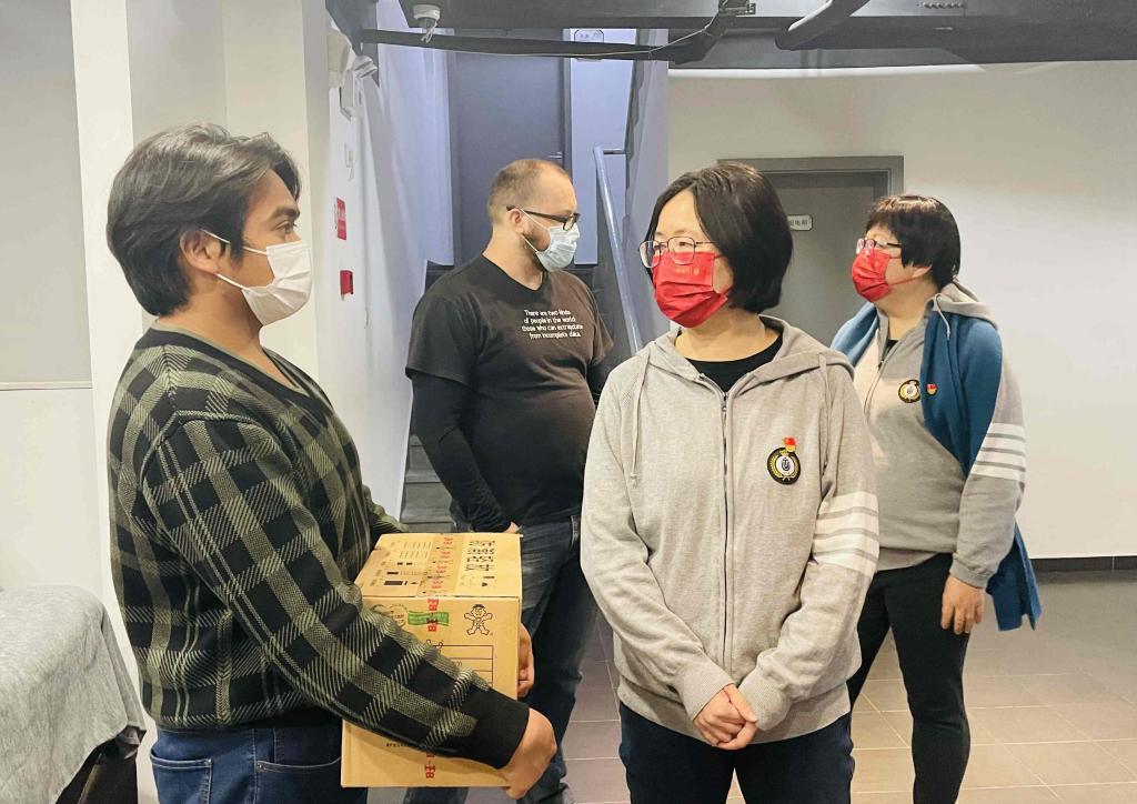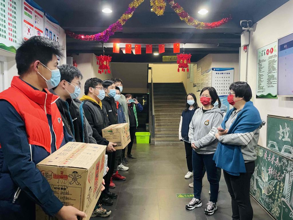 傍晚,吕康娟院长、胡笑寒副院长、卫静芬副书记、卞亦文副院长脚步遍及大半个嘉定校区,依次走访学生寝室4号楼、5号楼、谊园、C楼、D楼、9号楼,看望了学院统招本科生、国际本科生、外国留学生、研究生等各类学生群体,亲手送上雪饼、牛奶等小礼物,对同学们嘘寒问暖、叮嘱他们保持身体健康,坚持体育锻炼,继续上好网课,并同大家合影留念。