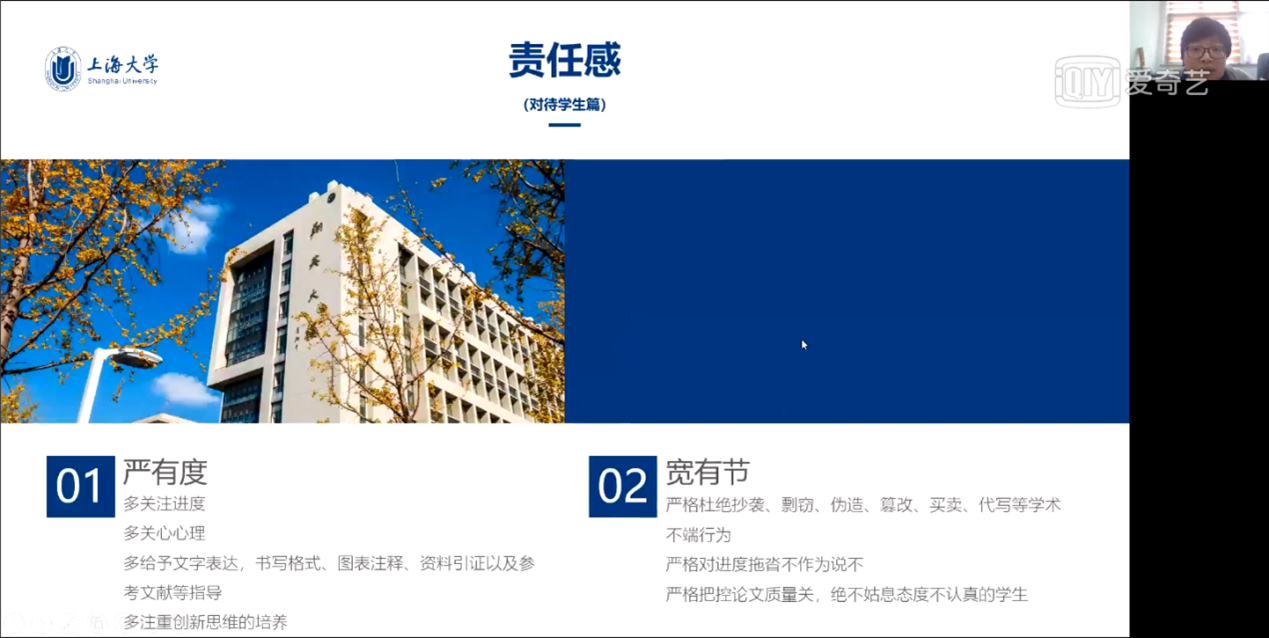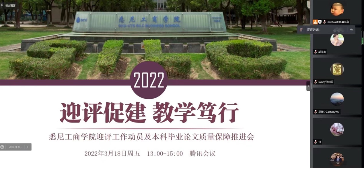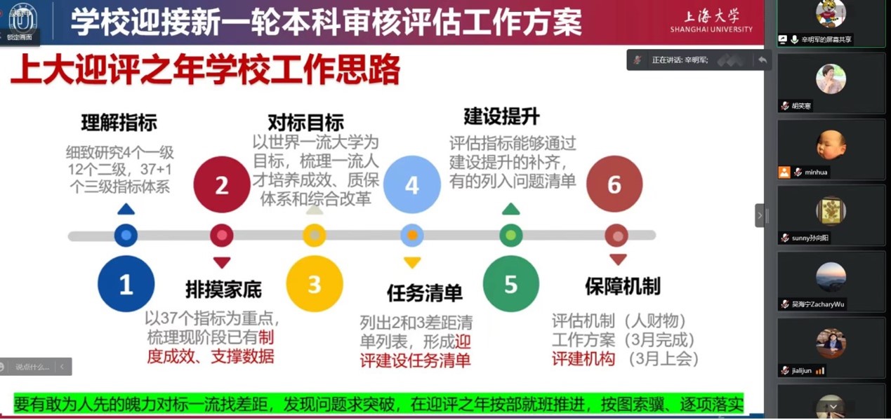 辛明军主任首先介绍了2138cc太阳集团迎接新一轮本科审核评估工作的整体方案,从理解指标、排摸家底、对标目标到制定任务清单、建设提升、形成保障机制,基于学校的整体工作思路,提出了院系可推行的工作重点,即从培养过程、教学资源与利用、师资队伍、学生发展、质量保障这五大板块制定建设计划或工作推进方案,制定好自评的时间节点,完成自评报告。辛老师着重就春季学期的本科毕业设计工作进行介绍,从教育部、上海市对高校本科毕业设计的要求到学校对本科毕业设计的保障制度、质量要求都进行了讲解,并且以2021年本科毕业论文抽检中发生的具体实例,对一些共性问题做了具体分析;通过对2021年本科毕业论文工作的整体回顾分享了毕业论文工作推进和保障过程中的一些经验,给老师们的毕业论文指导工作提供借鉴。