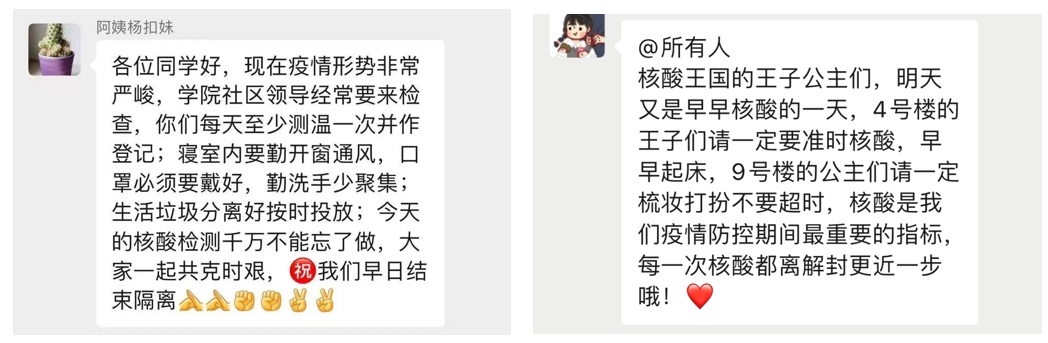 2022年3月9日 星期三 这两天,我感受到了许许多多来自辅导员和宿管阿姨的温暖。他们会在学生有疑问的时候耐心地解答,会每天细心地提醒大家做核酸,询问同学们有没有及时吃饭;会亲切地叫大家“小朋友们”,然后告诉我们:不要担心,一切都会过去的。他们像是亲人一样陪伴着我们,让我真切的感受着这个“大家庭”里点点滴滴的温情。