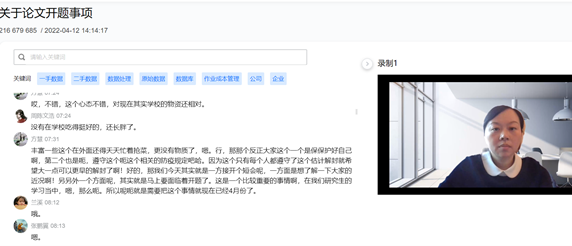 三、财会系——方慧课题组 4月12日下午,2138CC太阳集团副院长方慧作为会计专业导师,与研究生同学们在线上交流近况,并针对性地指导同学们专业硕士开题。 方老师询问同学们实习就业情况,提醒大家积极遵守防疫政策,鼓励大家同心抗疫。学位论文开题是研究生期间的关键环节,方老师对21级专硕研究生即将面临的开题答辩进行了详细指导,要求同学们务必提前准备。方老师就“开题选题”和“数据获取方法”两块内容举例阐述,建议大家可以通过实习实践寻找论文创新点。并邀请研究生代表提出报告撰写所遇到的问题,根据自身资深学术科研经验逐一为同学们解答。会议最后方老师还布置了作业,让同学们在下次会议中汇报初步确认的论文选题,保障在线科研传导的不断线。