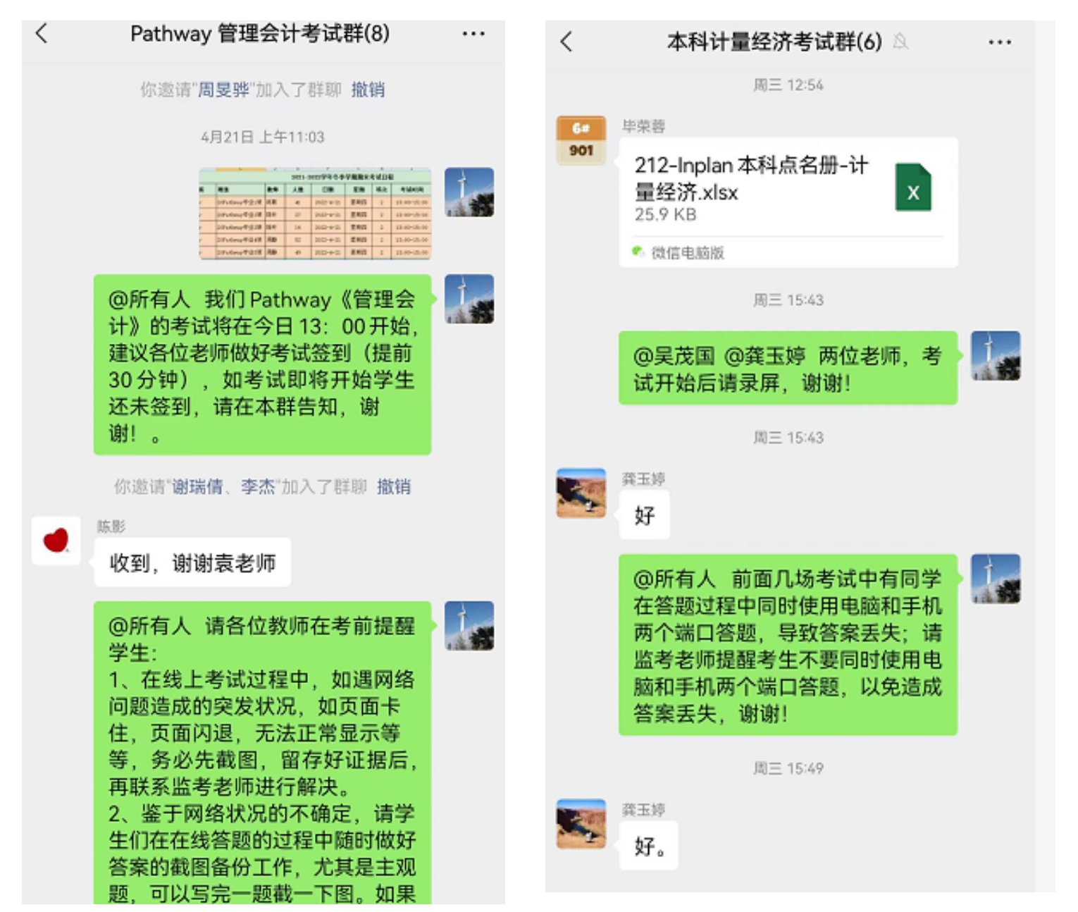 面向冬季学期任课教师,根据课程考核类型的不同分别建立集中考核工作群和自主考核工作群,将相关考试信息精准发放对应工作群,第一时间公布《2138CC太阳集团冬季学期末考试工作安排》。
