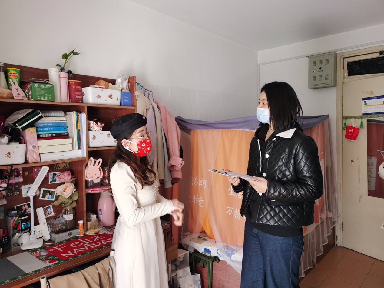 2、冲锋校园一线,带头当好示范者 3月7日,校区一名学生出现核酸异常,为配合防疫工作,辅导员纷纷进驻宿舍楼,于老师也进驻了实行封闭管理的1号宿舍楼,24小时守护在学生身边,每天在楼内消毒、分发物资、组织核酸检测、处理楼内垃圾,给予同学们物质支持和精神鼓励。“于老师在这段时间给了我们很多关怀,使我们不安的心情得到了疏解,很多人在关心和爱护着隔离中的我们,我们很感动。”19级张玉荣同学说。 3月下旬,嘉定校区防疫形势逐渐平稳,于老师在回家短暂休整后,毅然选择回到学校与同学们并肩战斗,搬到宿舍楼与同学们一同生活。于老师每日及时传达学校最新防疫信息与通知,统计每位学生的抗原、核酸完成情况,认真收集同学们学习生活中的各类问题,并及时逐级反馈。陈娅同学作为于老师的临时室友,深有感触:“我从第一视角,感受到她每日抗疫工作的繁杂,更感受到她对学生工作的热爱。她没有因为工作琐碎感到厌烦,而是依旧报以真心,仔细耐心地应对每一次突发事件。尤其是在解决同学购药难题上,她主动帮助同学寻找购药途径,不厌其烦地帮同学联系领导审批购药申请单。”