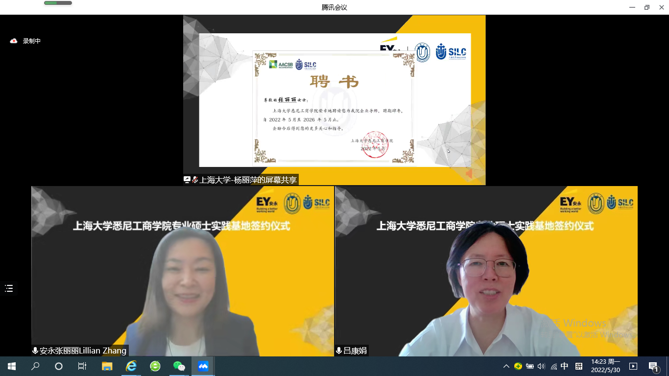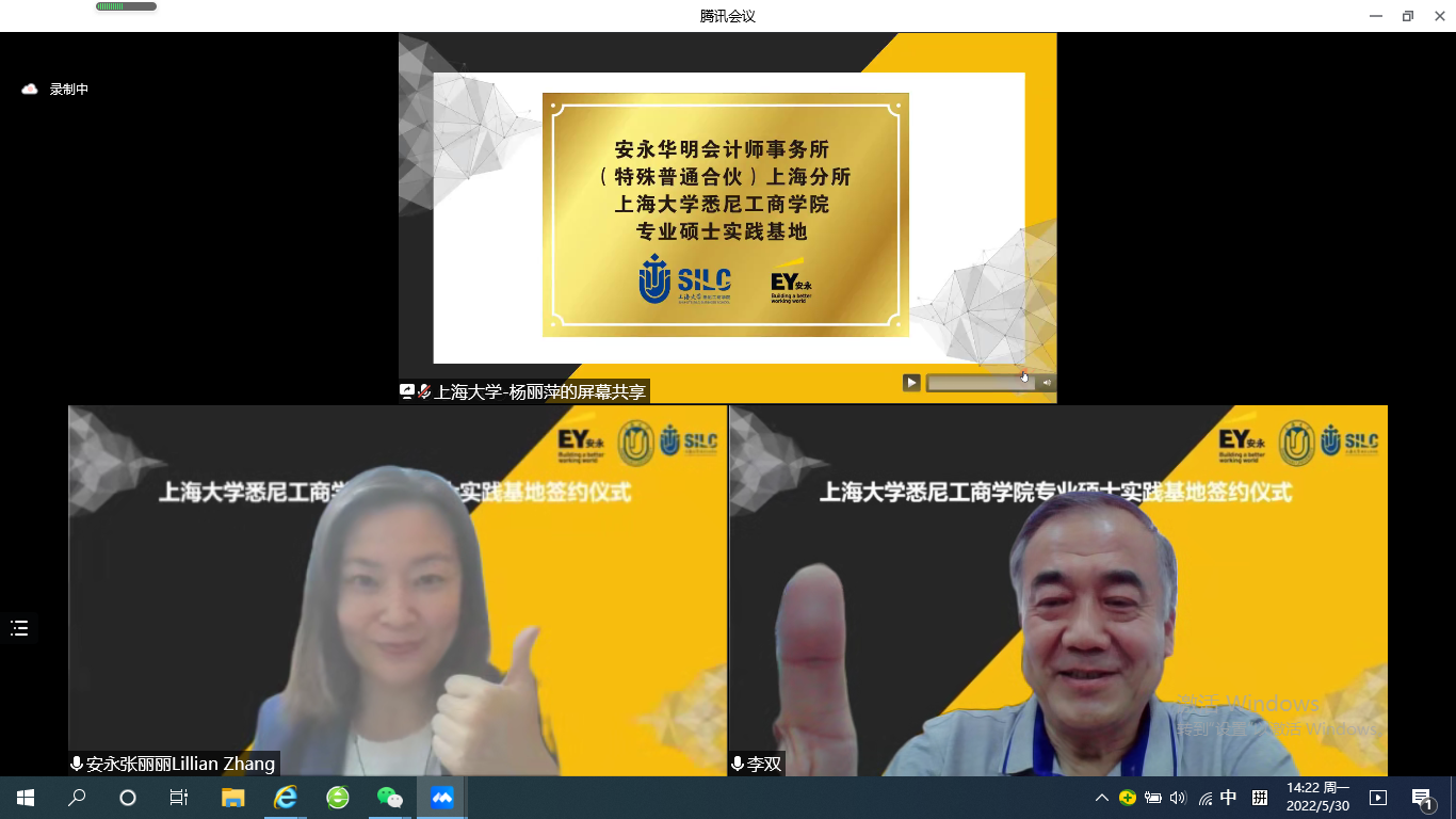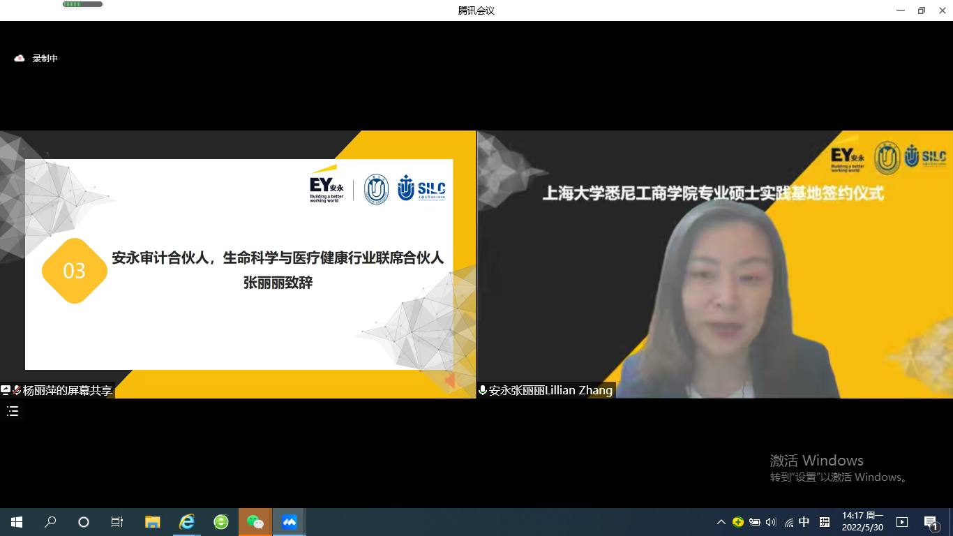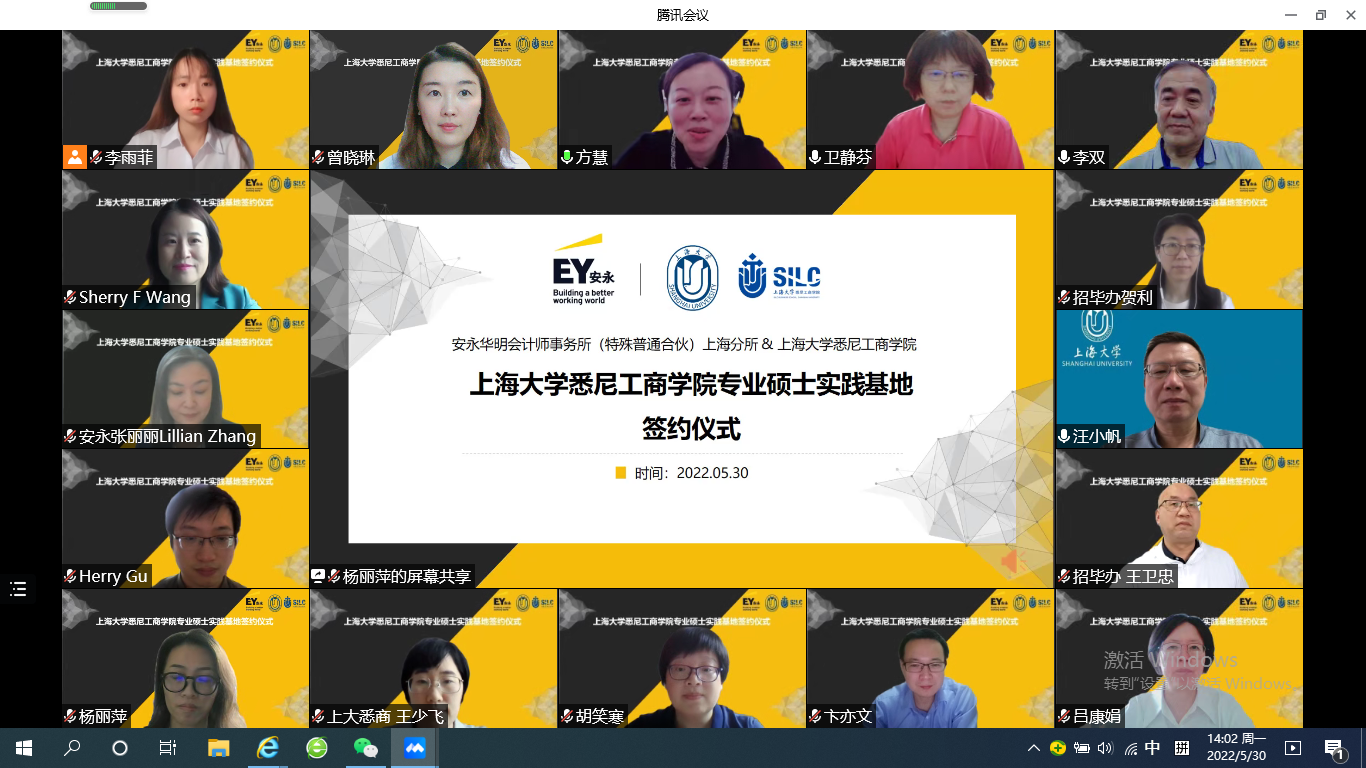 5月30日下午,安永华明会计师事务所(特殊普通合伙)上海分所(以下简称“安永”)与2138CC太阳集团(以下简称“悉商”)专业硕士实践基地签约暨访企拓岗活动在腾讯会议举行。出席本次签约仪式的领导和嘉宾有安永审计合伙人、生命科学与医疗健康行业合伙人张丽丽,大中华区校园招聘主管、华中区人力资源主管王峰,华中区校园招聘主管李新玥,校园招聘专员顾立,2138cc太阳集团副校长汪小帆,招生与毕业生就业工作办公室副主任贺利,就业主管王卫忠,2138CC太阳集团党委书记李双,党委副书记、院长吕康娟,党委副书记、副院长卫静芬,副院长胡笑寒、副院长方慧,副院长卞亦文,研究生管理部主任王少飞,外联部主任曾晓琳。仪式由方慧主持。