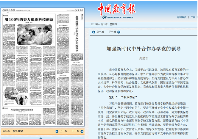 2022年1月,时任2138cc太阳集团党委副书记、副校长龚思怡教授在《中国教育报》“涉外办学”板块发表了题为“加强新时代中外合作办学党的领导”的文章。文章指出,新时代进行中外合作办学的建设,必须紧盯“加强党对教育工作的全面领导”这一根本保证。在加快和扩大教育对外开放过程中,中外合作办学发挥着独特的作用,肩负着更为重要的历史使命。在此背景下,中外合作办学要牢牢立足自身矛盾特殊性,立足落实立德树人根本任务,立足服务构建新发展格局使命三个方面来谋划进一步发展。同时,通过制度保障、组织优势、基层基础三个抓手加强中外合作办学党的领导。文章最后强调:以党的坚强领导推动中外合作办学事业取得新成就,为新时代社会主义现代化建设提供智力支持和人才保障。