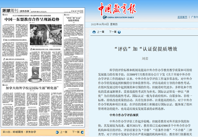 6月,我院刘蕾老师在《中国教育报》环球周刊涉外办学板块上发表题为“‘评估’加‘认证’促提质增效”的文章。文章基于当前高等教育评价改革的大背景,深入思考中外合作办学评估中面临的问题,结合2138CC太阳集团参加并获得AACSB国际商学院认证的经验,提出在进行中外合作办学评估的基础上,进行以“择优”为目的认证活动,能够促进中外合作办学真正实现提质增效。文章探讨了“评估”和“认证”相结合促进中外合作办学提质增效,表现在三个方面。即强调“主动申请”,解决了中外合作办学的“内驱力”问题;突出“使命驱动”,解决了评估标准过度量化的问题;参与“选拔性考试”,解决评估工作中对个性化考量不足的问题。