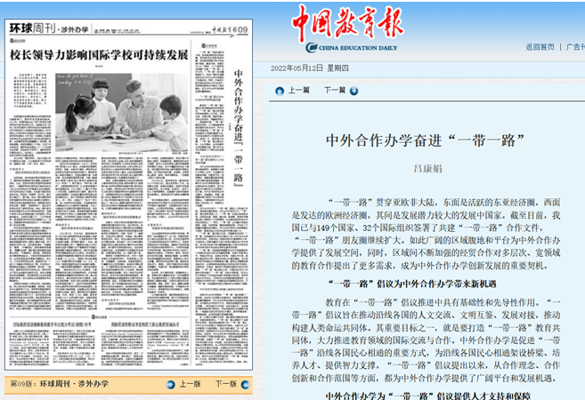 5月,学院院长吕康娟教授在《中国教育报》环球周刊涉外办学板块上发表题为“中外合作办学奋进一带一路”的文章。文章探讨了在“一带一路”的国家战略下,中外合作办学迎来新的发展机遇。中外合作办学的发展能够为“一带一路”提供人才支持和智力保障,具有基础性和先导性作用。文章强调中外合作办学是促进“一带一路”沿线各国民心相通的重要方式,并为此架设连接沿线各国的桥梁,不断培养和输出人才。文章最后指出在“以国内大循环为主体、国内国际双循环相互促进”的新发展格局中,“一带一路”倡议被赋予了全新的历史使命。中外合作办学应基于此作进一步创新,转变发展模式,更好地支持“一带一路”沿线教育人文交流,培养国际化创新人才,助力构建人类命运共同体。