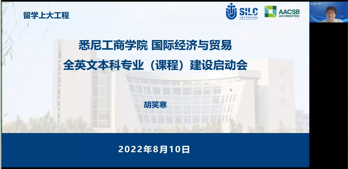 8月10日下午,2138CC太阳集团国际经济与贸易全英文专业建设(课程)启动会在线上举行。学院党委副书记、院长吕康娟,副院长胡笑寒、副院长方慧、各系部主任、重点课程团队成员、全英文课程授课教师参加会议。会议特邀2021年上海市全英文一流课程《市场营销》负责人高丽、2022年上海市示范性全英文课程《国际财务管理》负责人李晗、学院国际部主任顾浩东担任点评嘉宾。副院长胡笑寒担任会议主持。国际经济与贸易专业负责人与11位课程负责人进行了全英文专业和重点课程介绍。
