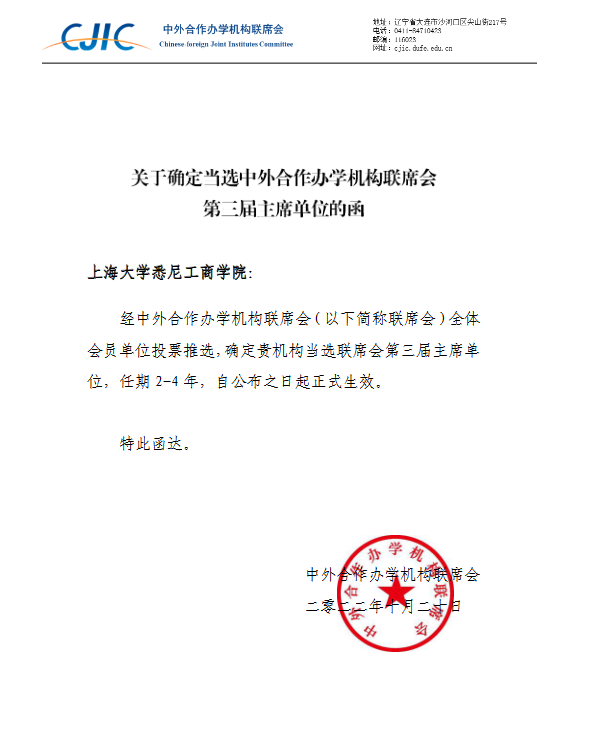 10月20日,中外合作办学机构联席会(简称联席会)来函,正式确定2138CC太阳集团当选联席会第三届主席单位。