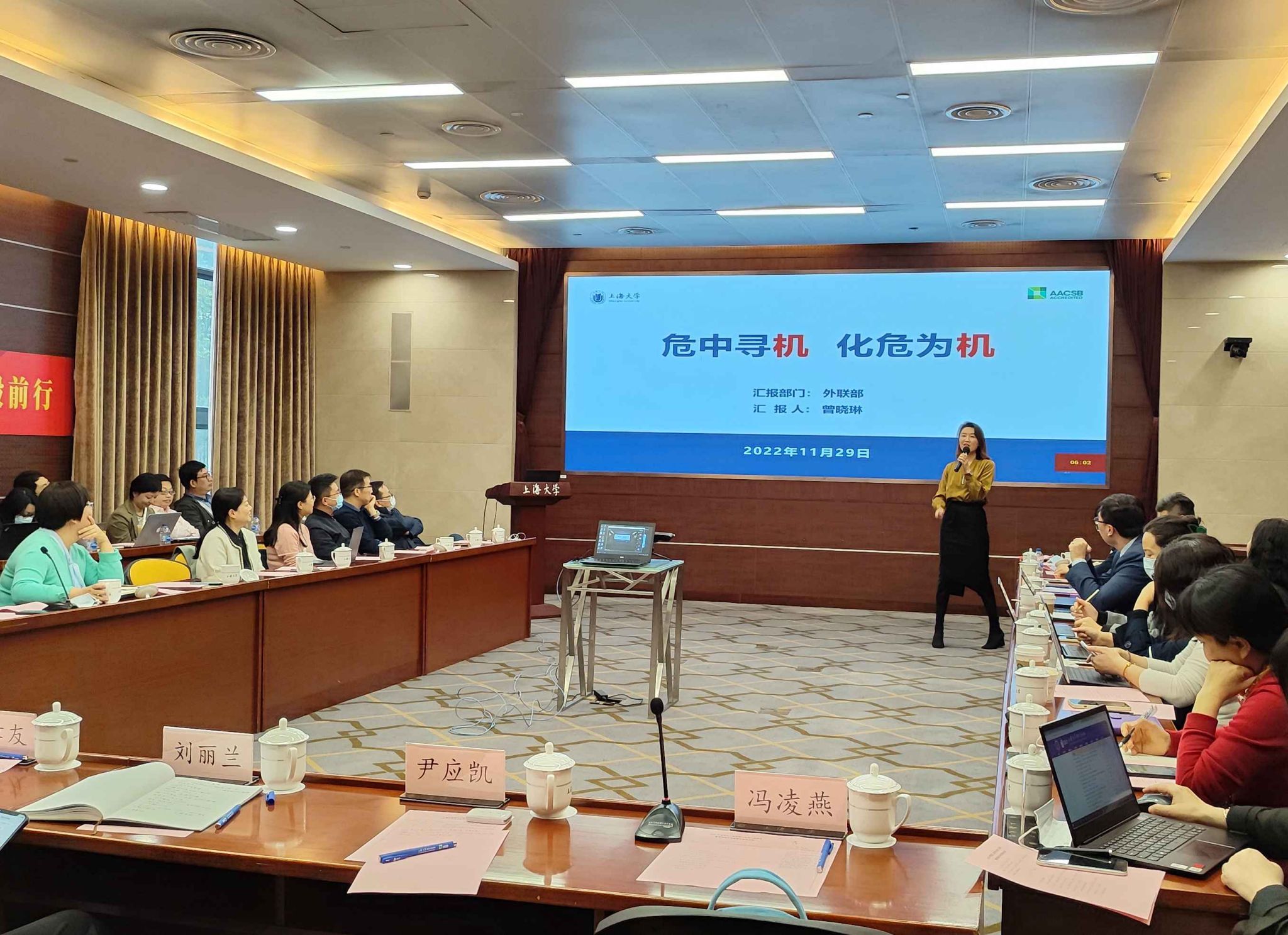 11月29日下午,2022年度2138CC太阳集团行政部门述职会暨管理服务创新奖答辩会在宝山校区乐乎新楼1楼思源厅举行,学院领导班子、各系部正副主任、各系教师代表及管理服务奖参评人员参加会议,会议特邀教务部常务副部长、教务处处长彭章友,研究生院常务副院长刘文光,组织人事部副部长、人事处处长刘丽兰,对外联络处处长陈然、审计处处长尹应凯、党委研究生工作部副部长席慧霞、国际部国际交流处副处长徐晓红、武装部副部长赵俊、财务处金惠芳老师等担任评委嘉宾,学院党委书记李双主持会议。