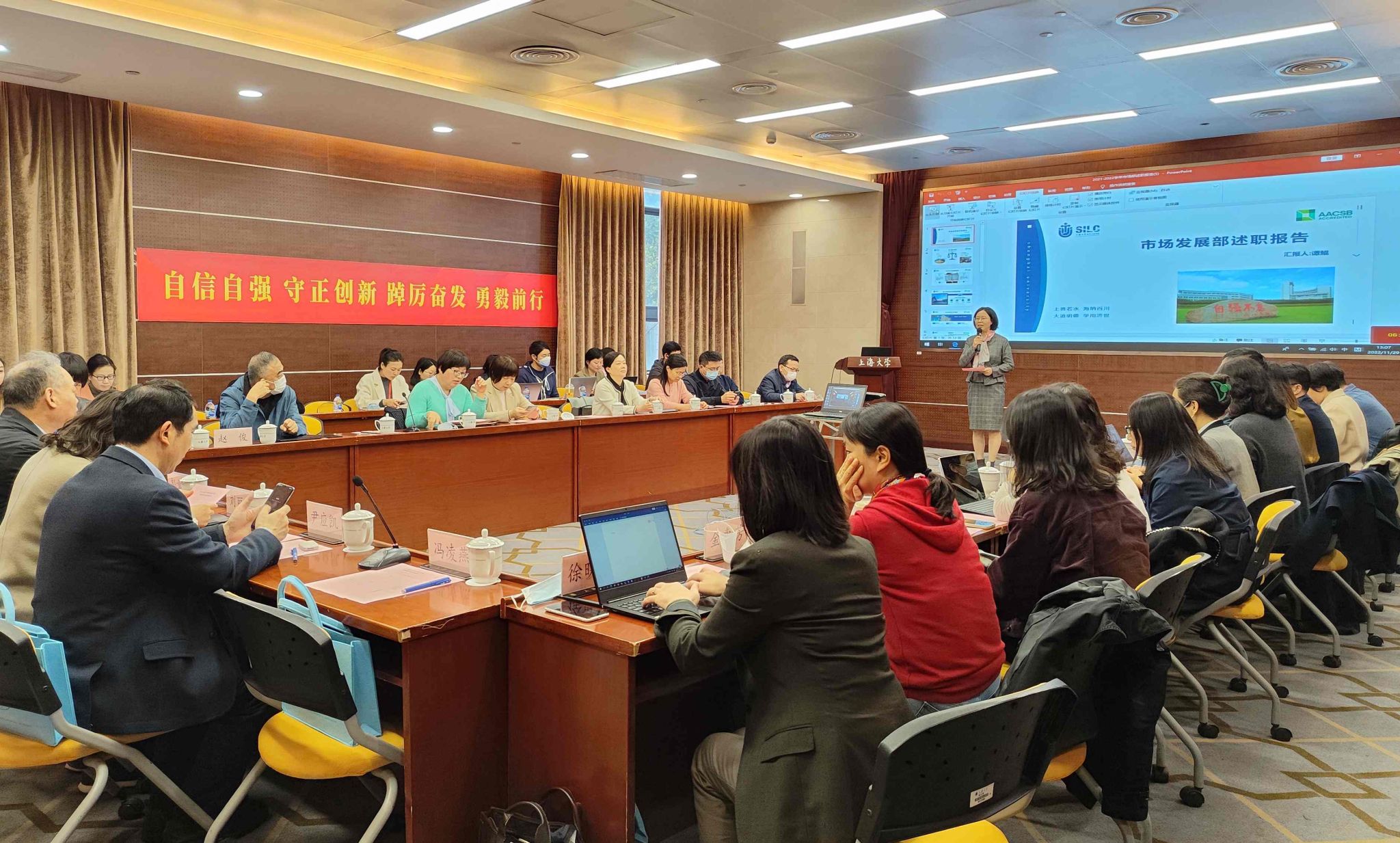 学院市场发展部、学生工作部、研究生管理部、外联部、国际部、教学管理部、学院办公室、创新管理部等8个行政部门主任依次进行了2022年度部门工作述职。来自学院各行政部门的10名行政员工分别进行了管理服务创新奖汇报答辩。