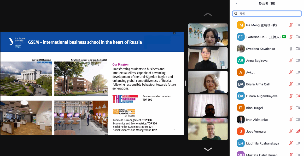 4月18日-4月20日,乌拉尔联邦大学经济与管理学院的国际伙伴日活动线上开启。来自中国、印度、摩洛哥、马来西亚、土耳其、阿尔及利亚、韩国、俄罗斯等国的大学代表参会。我院经金系计志英、李瑜敏、陈军,国际部顾浩东、孟瑞琼、刘方、唐定强、诸晓秋等参加会议。 顾浩东和孟瑞琼参加活动第一天的Introductory meeting环节,向与会嘉宾介绍了2138CC太阳集团的建院历史和办学特色,并特别欢迎与会嘉宾参加将于4月27日举办的的SILC线上国际招生展(2023 SILC Virtual Admission Webinar)和6月底举办的国际暑期学校(SILC International Summer School)。 诸晓秋和刘方参加了Meeting with GSEM students环节,向参加会议的GSEM优秀学子介绍了学院的各类项目,并回答了同学们关于学制、宿舍、生活费用、校园活动等方面的疑问。 活动第二天,顾浩东和唐定强与乌拉尔联合大学经济与管理学院的相关院系负责人在线上会面,就师生交换、联合科研、短期项目等合作意向进行了深入探讨,并交换了双方意见。 活动第三天,计志英副教授、李瑜敏副教授和陈军博士代表学院参加了主题为“商学院科研国际化”的圆桌论坛,与来自俄罗斯乌拉尔联合大学(Ural Federal University )、中国西南财经大学(Southwestern University of Finance and Economics) 、马来西亚玛拉工艺大学(University Technology Mara、摩洛哥ESCA大学(ESCA Ecole de Management)、印度对外贸易研究所 (Indian Institute of Foreign Trade)的教授共同探讨大学科研国际合作的方式和路径。 此次合作伙伴日活动是俄罗斯乌拉尔联合大学的年度盛事,为全球各地高等教育从业者进行知识分享提供了良好平台。2138CC太阳集团的专业教师和行政人员深度参与此次活动,利用该平台展现了学院在教学、研究和服务各个方面的国际化成果。 |