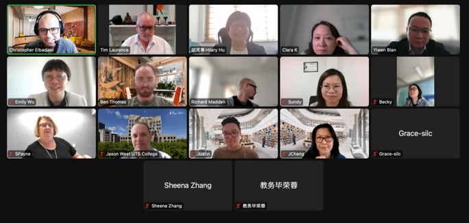 会上,双方对上一次会议的待办事项逐一做了确认。Richard Madden对本学年英语课程的教学及考试情况、英语教师队伍建设、Canvas教辅系统应用等内容做出报告。吴怡老师对UTS College商科课程的学生成绩分布、教师教学反馈等内容做出报告。双方就新一轮商科基础课程的建设、教辅系统等多个问题进行了细致讨论。最后,胡院长表示SILC将与UTS College通力合作,为学生提供与澳洲同步的学习体验,以保证课程教学高质量运行。