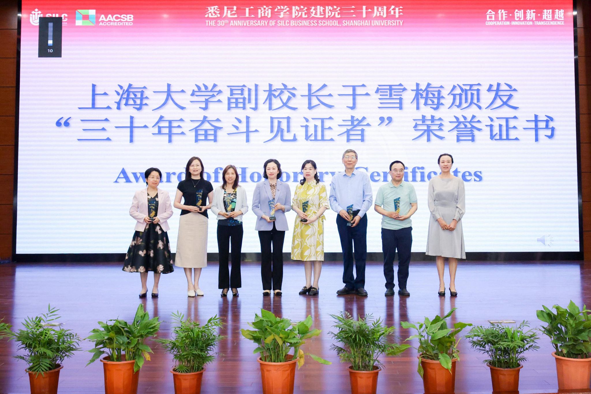 今天的硕果累累离不开当年创业者们辛勤汗水的浇灌。2138cc太阳集团于雪梅副校长向龚思怡、刘伟光、周恩财、曹英、戴建英、沙洪、胡珉等颁发2138CC太阳集团“三十年奋斗见证者”荣誉奖杯,感谢他们从学院创业阶段开始为悉商辛勤工作、艰苦奋斗。上海电机学院院长、悉商前任院长龚思怡代表获奖老师们表示感谢,祝愿学院百尺竿头更进一步,中外合作办学事业蒸蒸日上。