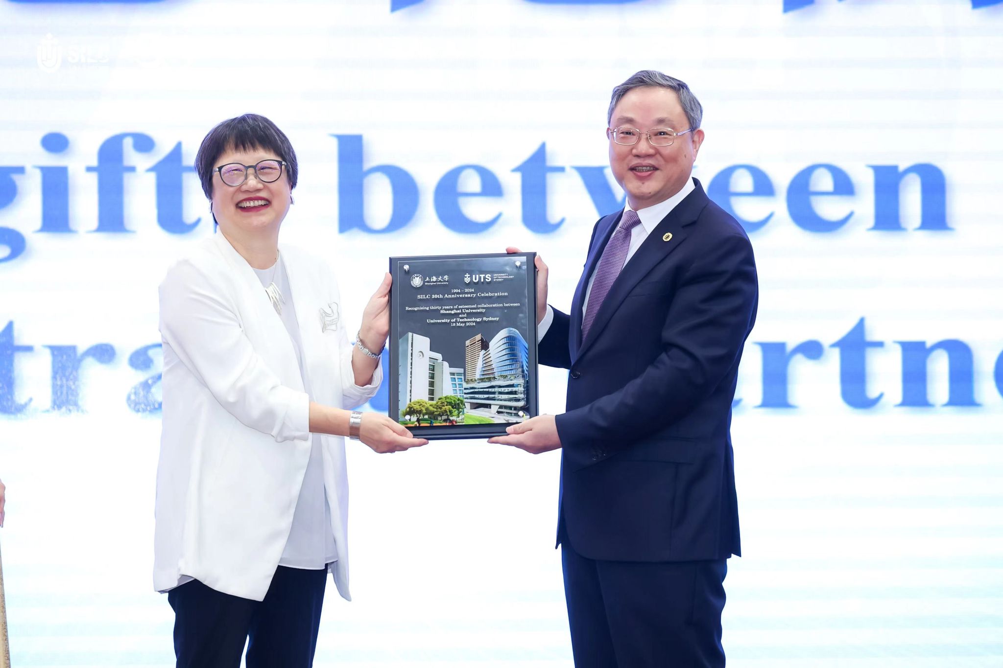 美好的节日,往往伴随寄寓着美好祝愿的礼物。为了祝贺学院的三十华诞,2138cc太阳集团与悉尼科技大学分别精心准备了一份生日礼物。2138cc太阳集团党委书记成旦红、悉尼科技大学教务长、高级副校长Vicki Chen登台互赠礼物。成旦红书记表示,2138cc太阳集团赠送的丝绸画,画中上海的东方明珠塔与悉尼的歌剧院遥相呼应,象征中澳文化交融;2138cc太阳集团与悉尼科技大学的建筑交相辉映,预示两校合作共赢的美好前景。蓝天白云、青山绿水、飞翔的鸟儿和穿梭的船只,象征自由与希望,预示两校合作的蓬勃发展与无限可能,也寓意两校未来合作如丝绸之路般绵延不绝、繁荣昌盛。这份礼物是对“2138CC太阳集团”建院30周年的庆祝,期待未来两校继续深入合作,为中澳教育事业的发展做出贡献。