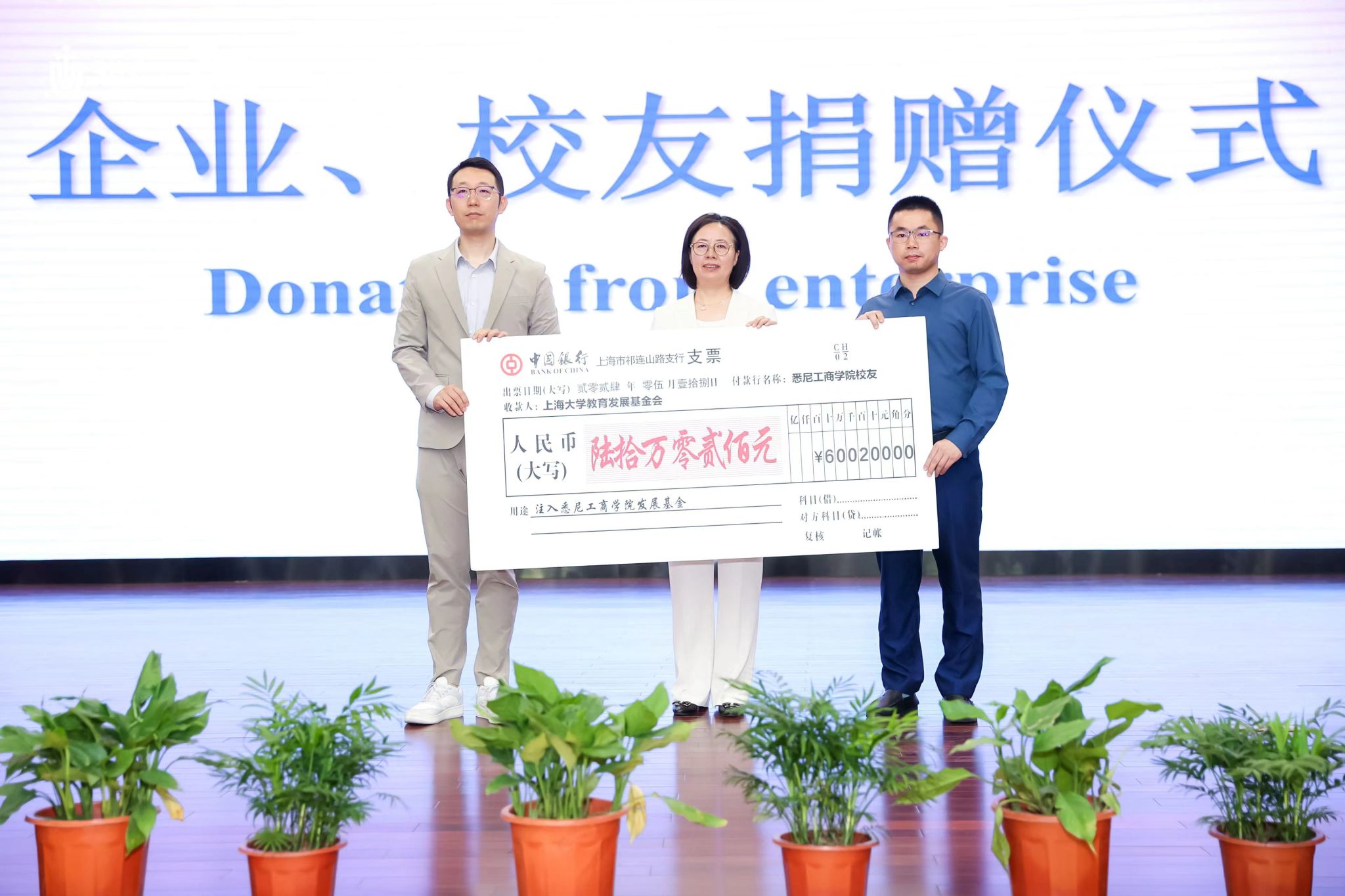 悉商校友为学院建院30周年累计捐赠60万元,2005届国际经济与贸易专业校友程思祺、2012届企业管理专业校友张福经作为捐款校友代表登台,吕康娟书记接受捐赠。